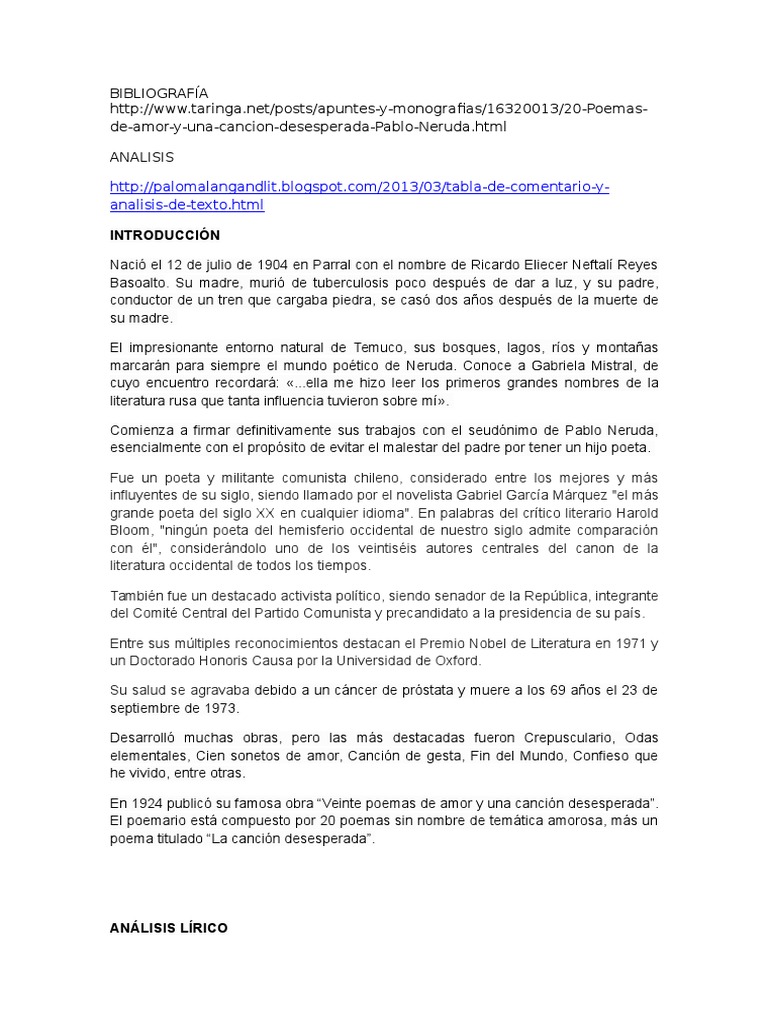 Veinte poemas de amor y una canción desesperada. El propio poeta seal que veinte poemas de amor y una cancin desesperada son el resultado consciente de sustituir la ambicin potica y la gran. → subgénero (himno, canción, égloga, elegía, oda, romance, letrilla. Pablo neruda nació el 12 de julio de 1904 en parral, chile y fue un poeta y militante comunista , considerado entre los mejores y más influyentes de su siglo, siendo llamado por muchos el más grande poeta del siglo xx. En este trabajo se plantea el análisis del poema 20 y una canción desesperada.